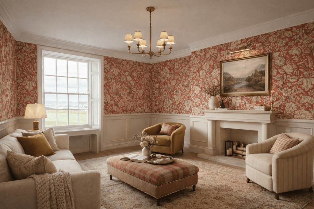 Once the bathroom is finished, we are starting the living room. It was a toss up between that, the garden room and the garden itself, which we posted in-depth ideas of on our YouTube. You guys voted, and the living room won as the next project, which we’re really excited to get started with, just as soon as the bathroom is finished. But I’m worried I’m missing something. Is there a purpose or layout change I should do, before it’s too late? I posted 4 different designs on Facebook and Instagram, and although it was very close, I think most people voted for a ‘Bridgerton’ kind of scheme: feminine, heritage and typical English country. I’ll post the picture below; I’m going to make some amendments to it as my mindless late-night wandering wasn’t so mindless after all, and I was struck with some new additions to the design.